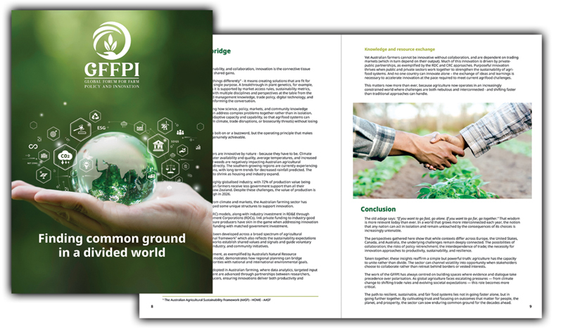 ‘Finding Common Ground in a Divided World’ explores how global agriculture can remain both sustainable, resilient and profitable amid profound geopolitical, economic, and environmental change. Developed by the Global Forum on Farm Policy and Innovation (GFFPI) – a collaboration between leading agricultural think tanks from Australia, Canada, the European Union, and the United States includign the Forum for the Future of Agriculture – the paper brings together diverse perspectives to inform constructive dialogue on the future of food and farm policy.