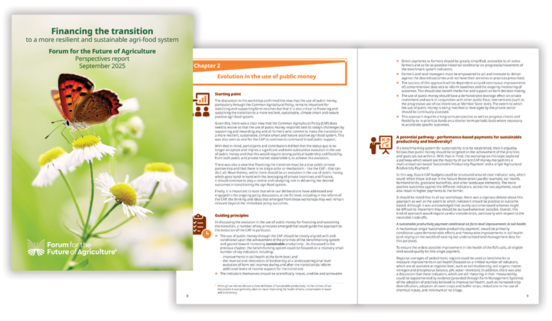 The transition to a more resilient and sustainable agri-food system depends in large part on the ability to make better use of existing and unlocking new financial incentives to drive and sustain the transition. Between late 2024 and the Summer of 2025, the Forum for the Future of Agriculture, together with its partners and stakeholders, explored through a series of workshops the opportunities and challenges in doing this and how to take a systemic approach to financing the transition.